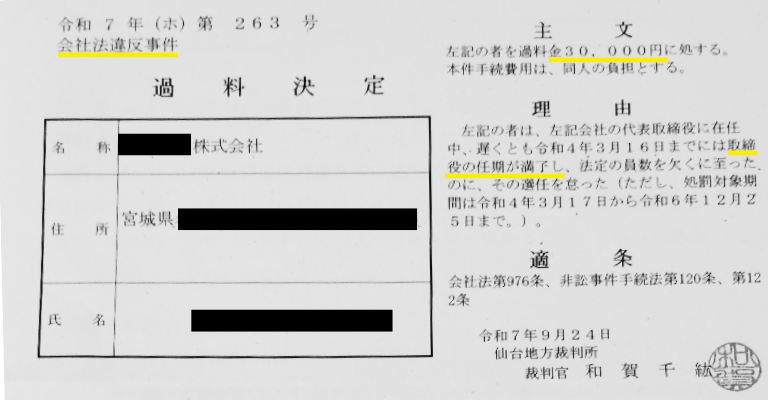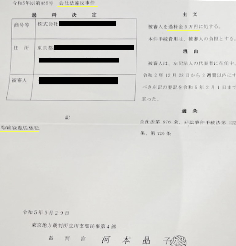 下記の実例は2010年11月に設立した会社で、2020年に重任(役員の更新)をしないまま3年が経って、裁判所から通達が来ました。